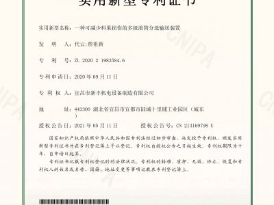 實(shí)用新型專利證書《一種可減少料果損傷的多級滾筒分選輸送裝置》