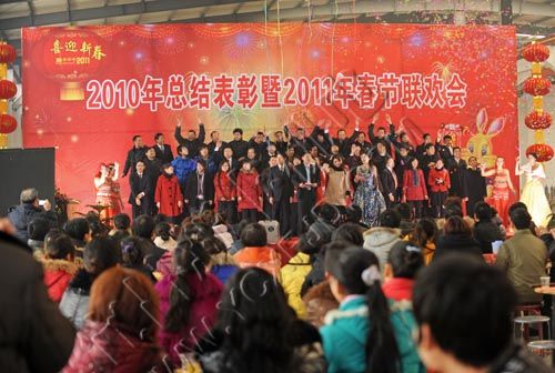 1月24日,宜昌市新豐機電設備制造有限公司董事長張本新攜夫人在表演文藝節目。當天,該公司舉行表彰和聯歡會,400多名公司員工和家屬歡聚一堂,喜迎新年的到來。
