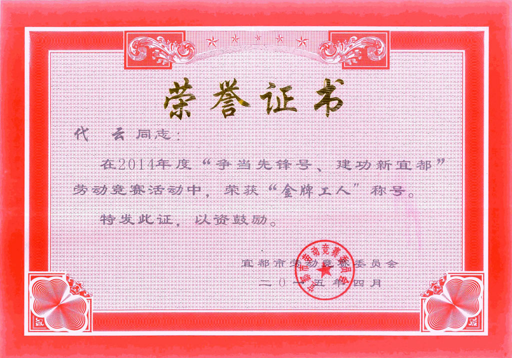 宜昌市新豐機(jī)電公司技術(shù)部長代云同志,在2014年度“爭當(dāng)先鋒號、建功新宜都”勞動競賽活動中,經(jīng)宜都市勞動競賽委員會評選為“金牌工人”榮譽(yù)稱號。